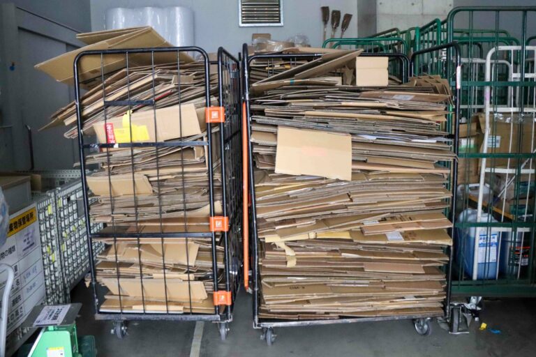 Sin embargo, entre bastidores, se genera una gran cantidad de cajas de cartón que se utilizan como embalaje para los productos entrantes. Planet Osaka, en la ciudad de Sakai, es un centro logístico con uno de los mayores volúmenes de entrada y salida. Anteriormente, era necesario manipular y desechar manualmente aproximadamente 20 toneladas de cajas de cartón al mes, pero en picos de demanda puede llegar a una tonelada al día. La cantidad de residuos de cartón es especialmente alta (300 kg) en la Zona A, en la primera planta, donde se recibe la mercancía, lo que ha generado los siguientes problemas: