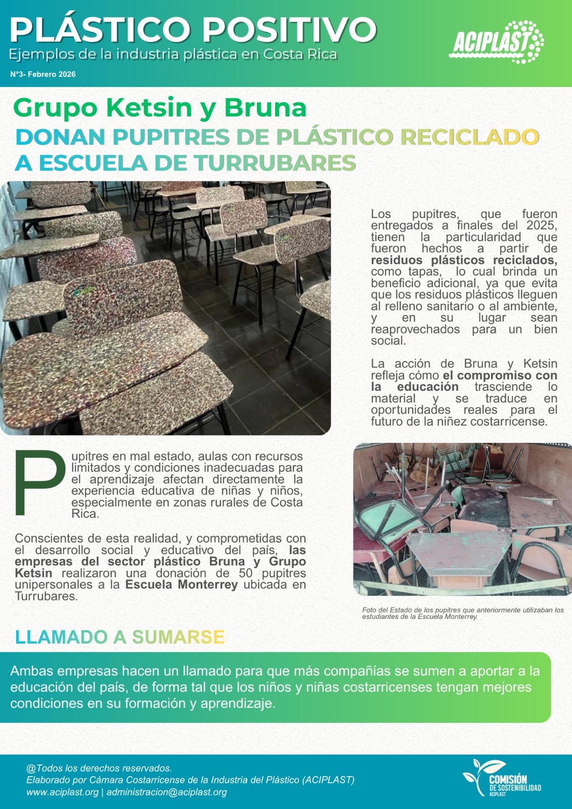 Un ejemplo inspirador: recientemente, las empresas asociadas Bruna y Grupo Ketsin donaron 50 pupitres unipersonales fabricados con materiales reciclados a la Escuela Monterrey, ubicada en Turrubares.